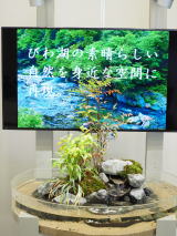 | 屋内ビオトープの背面にモニター(映像)を設置することで、新たな空間を演出します。 最新の映像・画像技術と自然素材を使った屋内ビオトープ 人工空間と自然空間が融合した新たな空間の創造です。 |